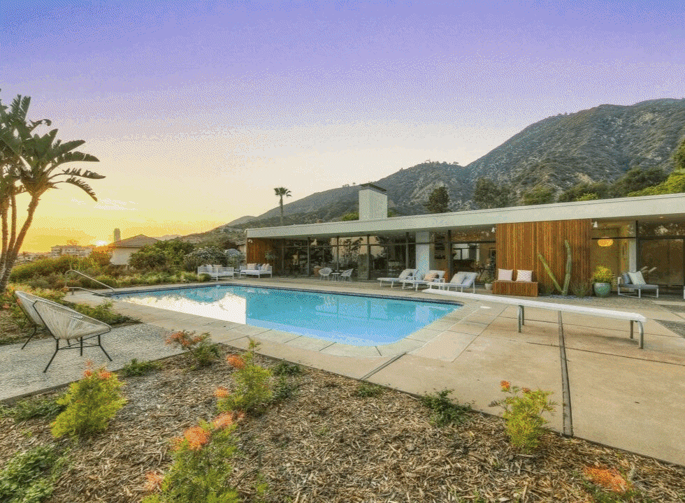 Masterful restoration of an extraordinary single level circa 1956 Mid-Century modern classic by John Galbraith AIA set on almost a full acre between the mountains above and the city lights below, with walls of glass and sliders opening to a huge flat lot with enormous swimmer's pool and breathtaking 180 panoramic views. Formal entry foyer with stone floor leads to entertainers open living and dining rooms with polished concrete floors, redwood art wall, full wet cocktail bar and stunning two-sided fireplace with double floating hearths; all with glass walls framing the patio, yard, pool and sweeping spectacular view. Kitchen has been updated with chef's stainless appliances, new counter tops and lighting; and includes breakfast bar, revived original mahogany cabinetry and restored custom hood. Gorgeous primary suite with exquisite newly redesigned bath plus two guest bedrooms and den. Separate detached flex space for game room, artist's studio or offices. Oversized two car garage.