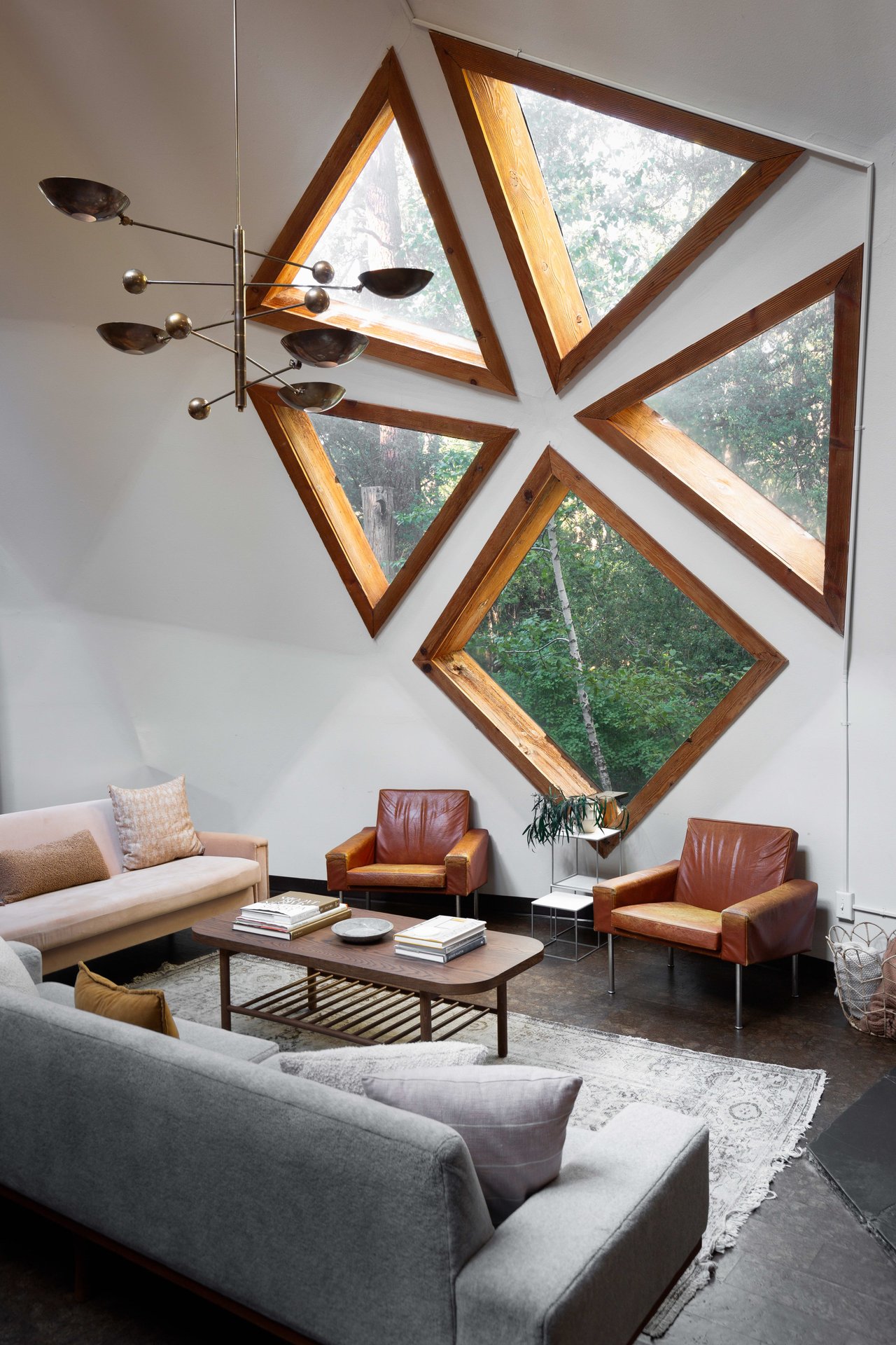 :: just Sold :: While experimental in nature at the time during their inception in the 1920s, Geodesic dome architecture would go on to become a beloved and rare style of home, creating an incredibly unique experience for those inhabiting within them. 54640 Lookout Road is just that, and seamlessly weaves itself into the surrounding lush Idyllwild mountainous backdrop. In this 1986 built spherical structure, a creative use of multi-shaped skylights bring a wave of natural light into the main spaces, and a scenic view of the sunsets in the evenings and stars at night. Quiet and secluded, the property offers a unique mountain experience mixed with modern amenities, original warm panelling and stylish, sharp design. A recently revamped kitchen features polished concrete counter tops and stainless steel appliances. Additional newer upgrades include cork flooring, a new hot tub, new water heater, new washer / dryer and new guest house roof. Walkable to Downtown and hiking trails. An ideal vacation home or primary residence in one of the most desirable locations in Idyllwild.
