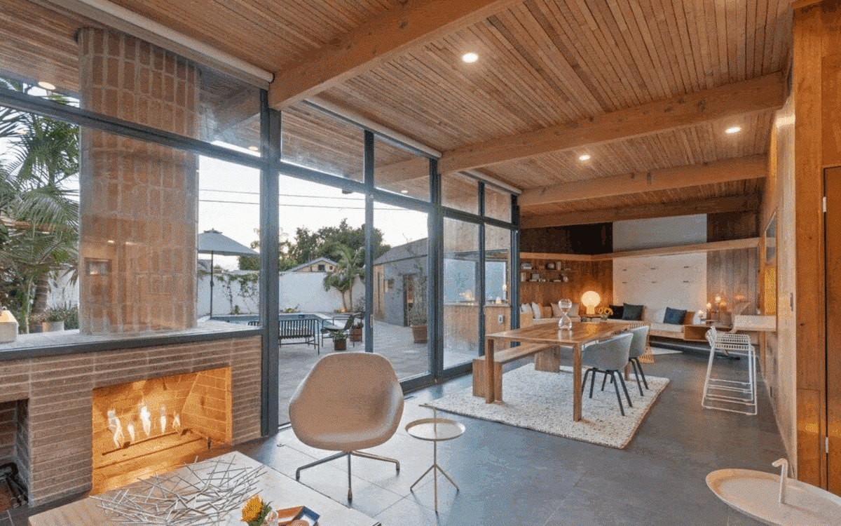 The Mid-Century you have been waiting for. . Unique, large and highly preserved mid-century home in Jefferson Park; it's the perfect symmetry of the trends featuring in many case study homes of the time. The house features stone floors and Caliza tile rock. The original casing windows and sliding doors open up the living areas to the pool and the outdoor patio. The living area consists of two large living rooms featuring the original beech wood built-ins and walls paneled in the original walnut. The original brick fireplace is fully functioning and beautifully preserved. Post-and-beam construction exposes the original wood ceiling throughout the living room, office-den and two bedrooms. The kitchen retains the original upper cabinets and passthroughs with updated lower cabinets and stainless steel appliances. The large master bedroom also retains original wall paneling and ceiling. The bedroom opens up to a patio and has a dressing area. All bathrooms have been updated. The pool retains its original shape and is accompanied by a separate 350 sqft guest house (not included in square footage), complete with bathroom, laundry and kitchen. The home is equipped with Ring security system and Nest. See private remarks for additional information. All COVID mandates and requirements to comply with health laws will be observed.